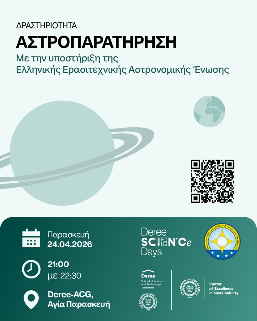 Παρασκευή 24.4.2026: Κολλέγιο Deree, Αγία Παρασκευή, στα πλαίσια του Deree Science Days.