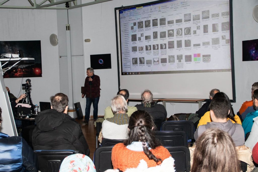 Η συνάντηση ξεκίνησε με ομιλία του Δημήτρη Μπαλάση για τις οφθαλμαπάτες που εμφανίζονται όταν βλέπουμε κρατήρες της Σελήνης, είτε μέσα από τηλεσκόπιο, είτε απόn φωτογραφίες. Εξήγησε τους λόγους για τους οποίους παρουσιάζονται οι οφθαλμαπάτες και έδειξε παραδείγματα. Ο Δημήτρης συνέχισε με την παρουσίαση του Αλμανάκ 2026, με τα αστρονομικά φαινόμενα του έτους.